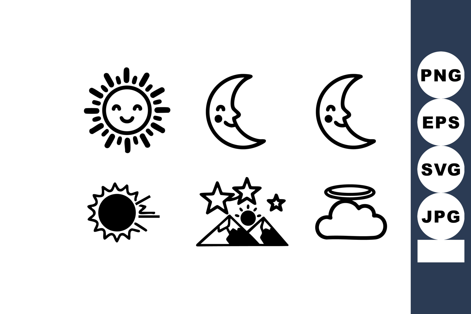 Vector icons display a cute smiling sun, crescent moons, stars over mountains, and a cloud with halo in simple black and white style, creating a playful and whimsical mood.
