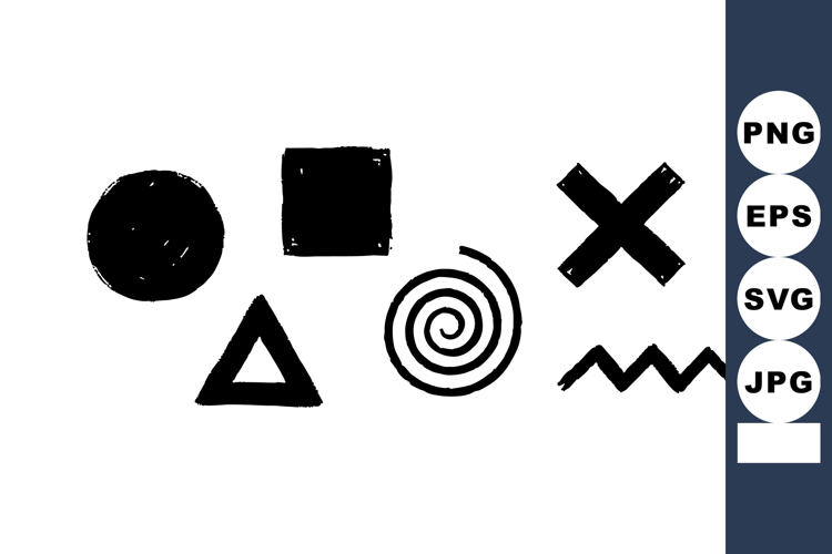 This vector image displays black geometric shapes such as circle, square, triangle, cross, spiral, and zigzag in a minimalist abstract style. Crisp and clean design, modern mood.