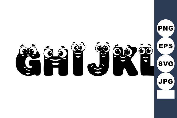 This vector features black cartoon-style alphabet letters from G to L, each with expressive eyes adding playful character and charm, perfect for creative or educational use. Cheerful mood.