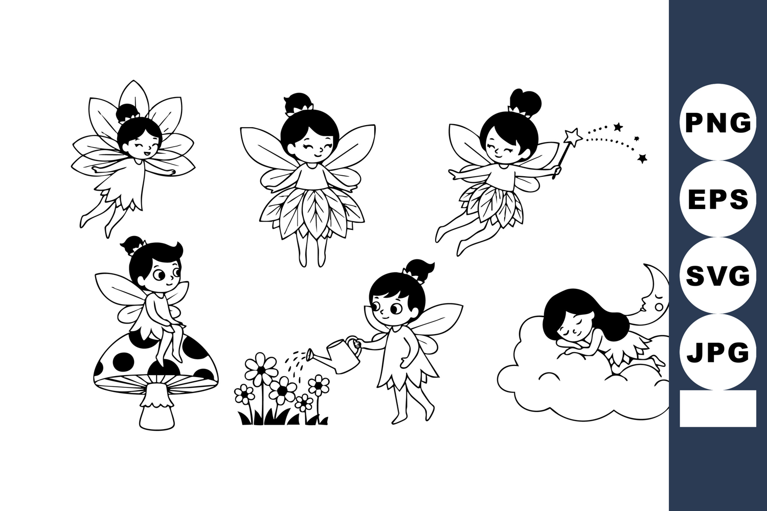 This vector features six cute fairy characters with wings performing magical actions and resting on clouds, mushrooms, and flowers in a playful black and white style, whimsical mood.
