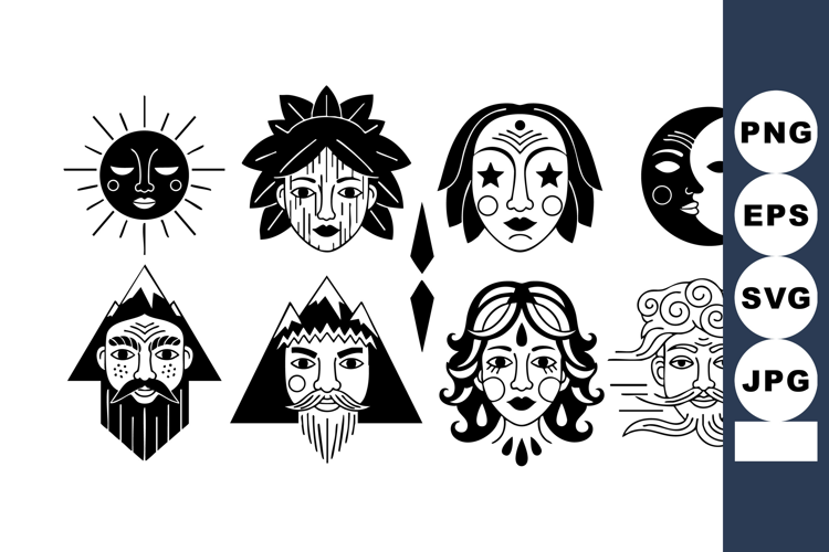 This vector set features black and white tribal masks with geometric shapes representing sun, moon, and human faces in an abstract style, conveying cultural symbolism and artistic expression, mysterious mood.