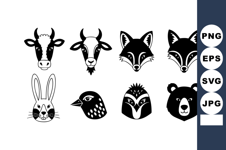 This vector set features animal faces including cow, goat, fox, rabbit, bird, owl, and bear in a clean black and white style, perfect for graphic design and illustration projects. Calm and simple mood.