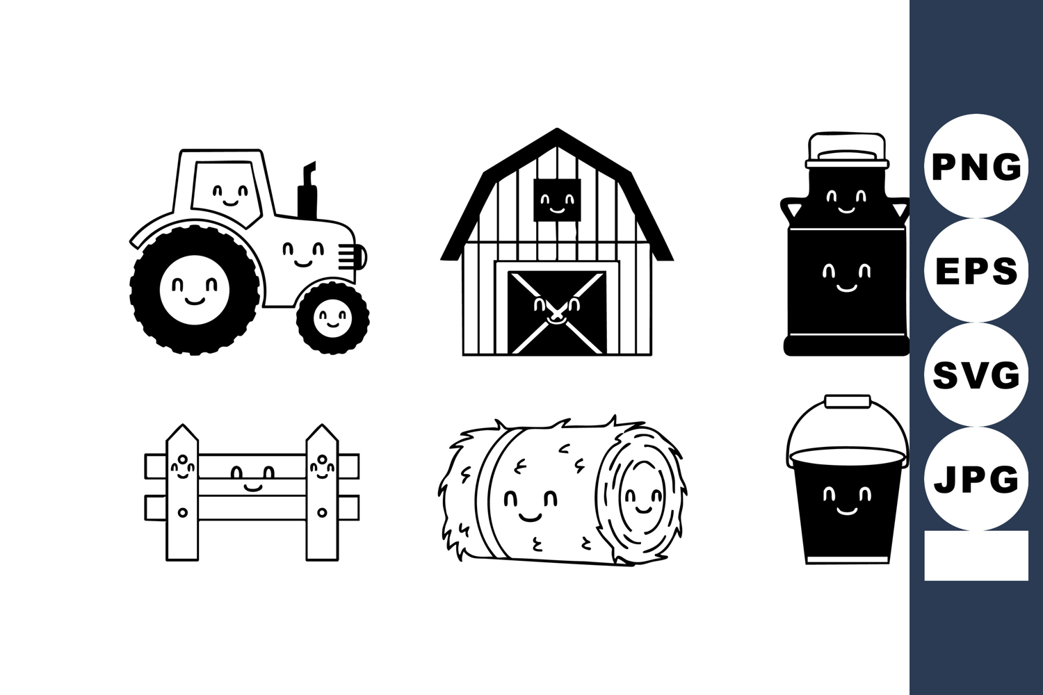 Vector icons showing farm equipment and barn including tractor, milk can, haystack, fence, and bucket with happy faces in simple black and white style, playful and cheerful.