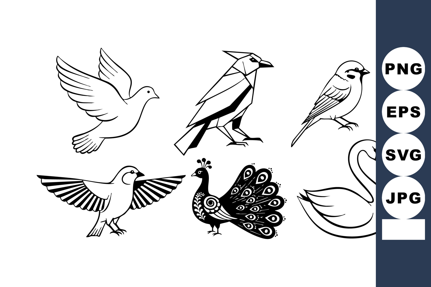 This vector file shows a group of different bird species in black and white line art style, including a dove, peacock, and swan, designed with clean and precise outlines, serene mood.