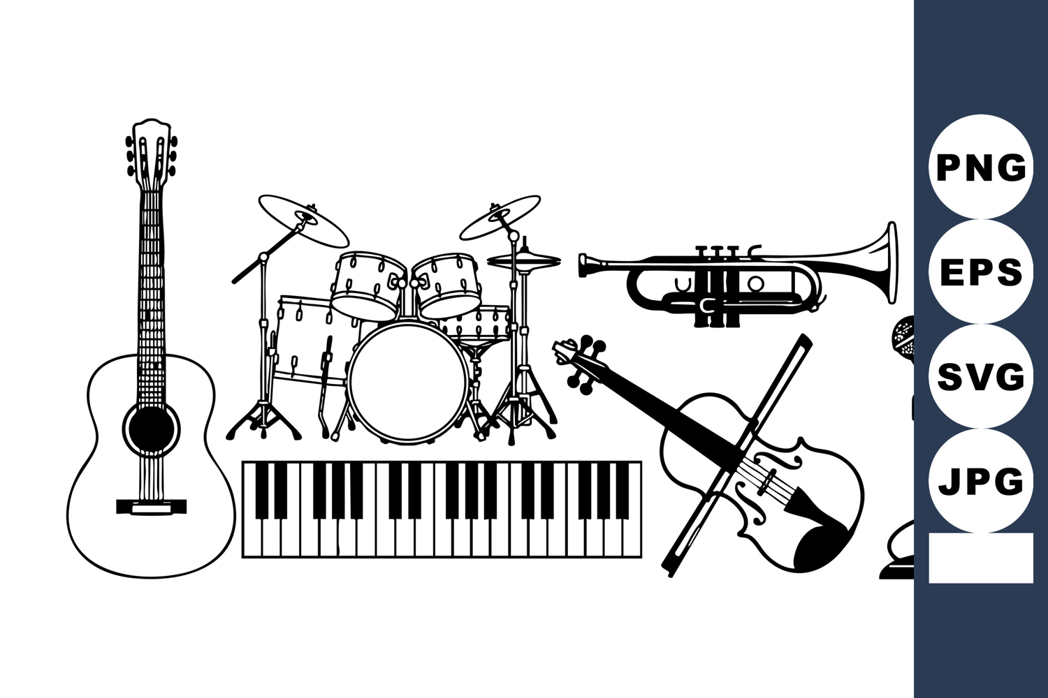 Vector illustration shows a collection of musical instruments including guitar, drum set, trumpet, violin, piano keyboard, and microphone in black and white style, clean and simple design. Calm and artistic.