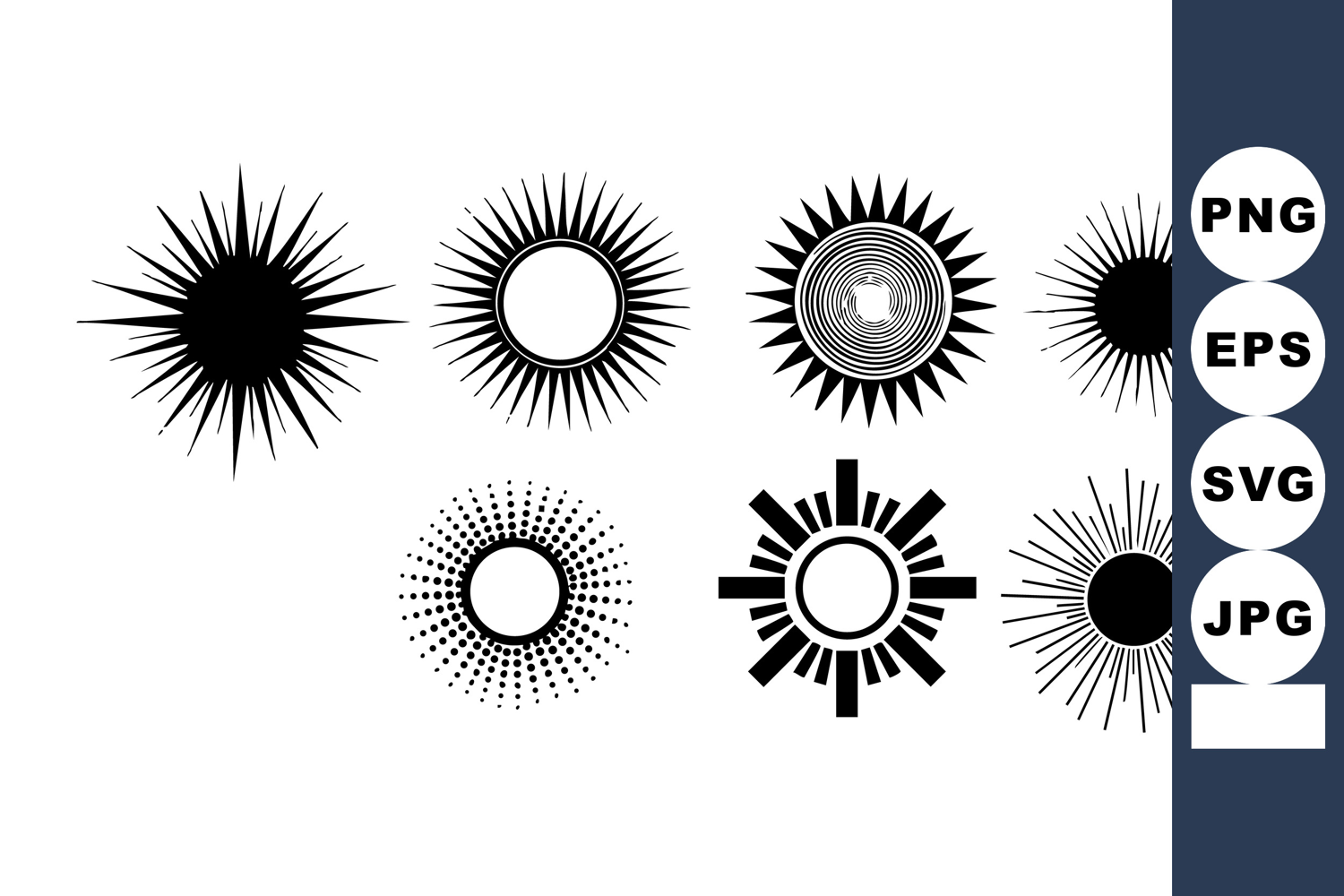 This vector file presents seven black sunburst design elements featuring radial rays and vintage style, perfect for creative decoration and graphic projects, conveying a bold, dynamic mood.