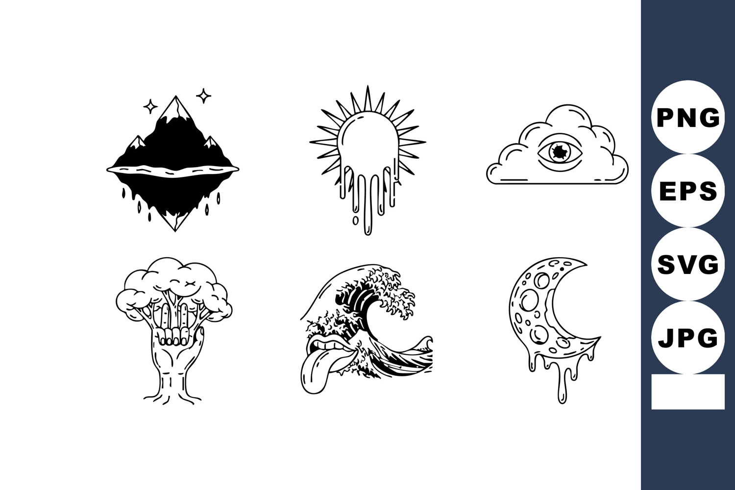 This vector features six abstract surreal nature elements including mountain, sun, cloud, tree, wave, and moon in a dripping style, presented in black and white, striking and artistic.