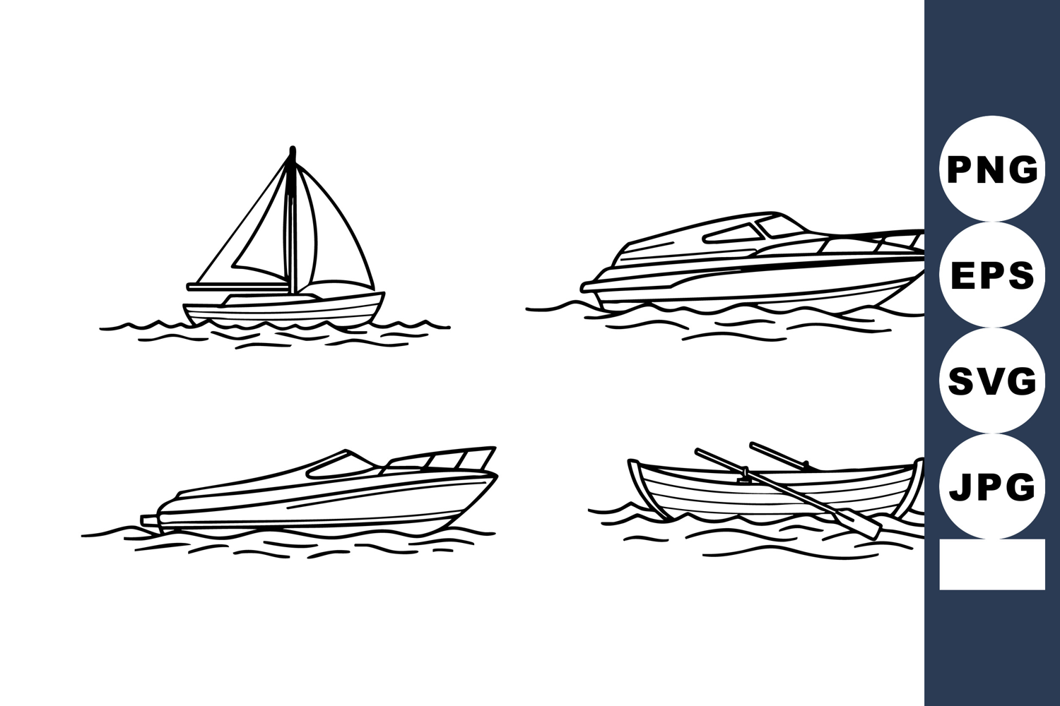 This vector illustration shows four different types of boats including a sailboat and motorboats on wavy water lines in a minimal black outline style. It conveys a calm nautical mood.