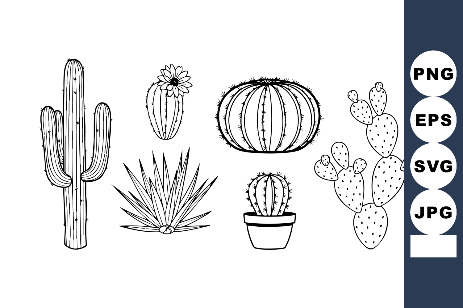 This vector features detailed black and white line drawings of diverse desert cacti and succulents, showcasing their unique shapes and textures with clean outlines. Artistic and minimalistic.