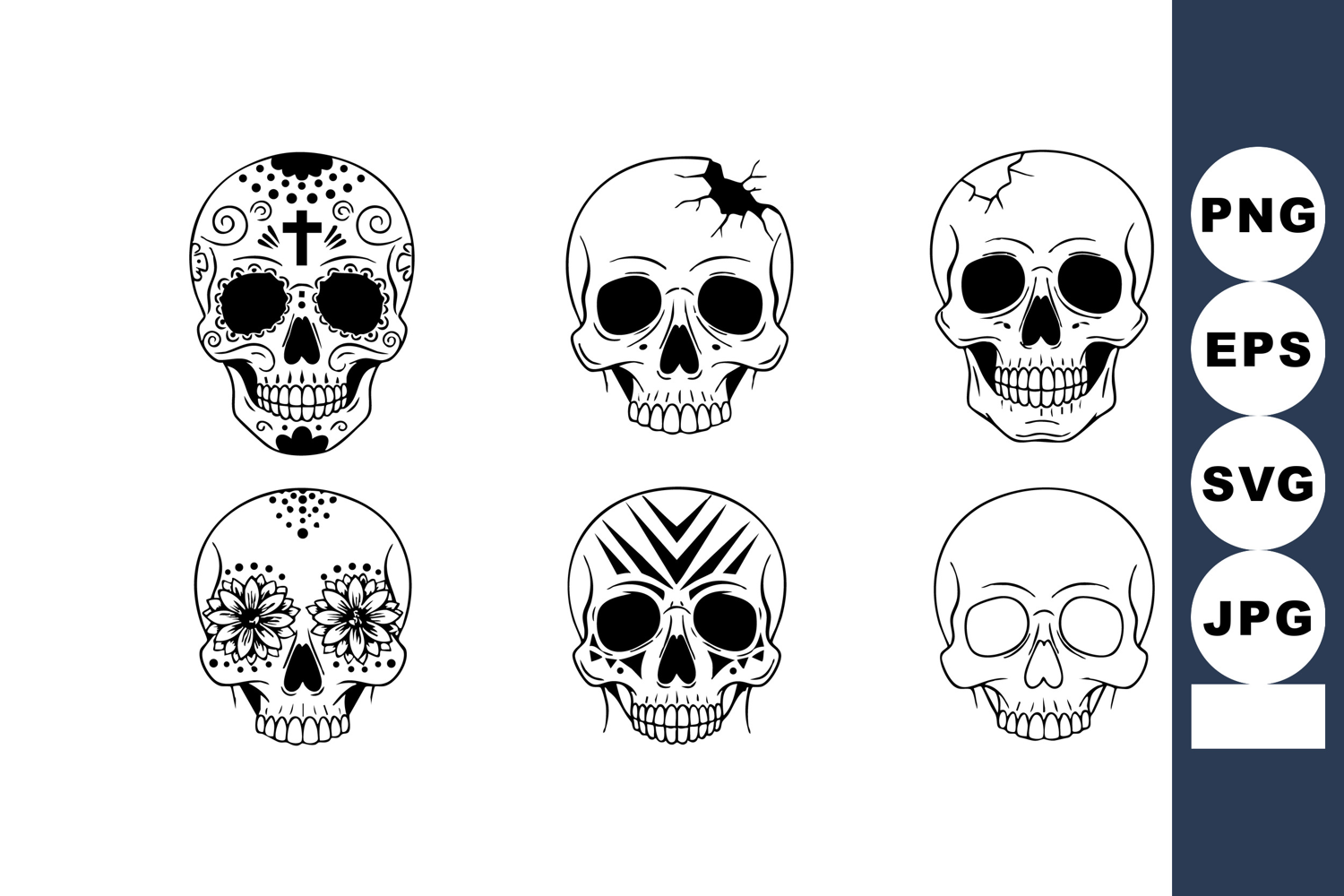 This vector image presents six distinct skulls with intricate designs, cracks, and glasses, rendered in black and white for festive or spooky themes. The style is bold and detailed, mysterious.