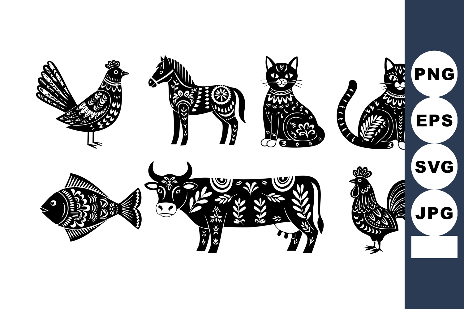 This vector features decorative black and white silhouettes of common farm animals adorned with floral and ornamental patterns. The design is elegant and artistic, perfect for rustic or vintage themes. Calm and charming.