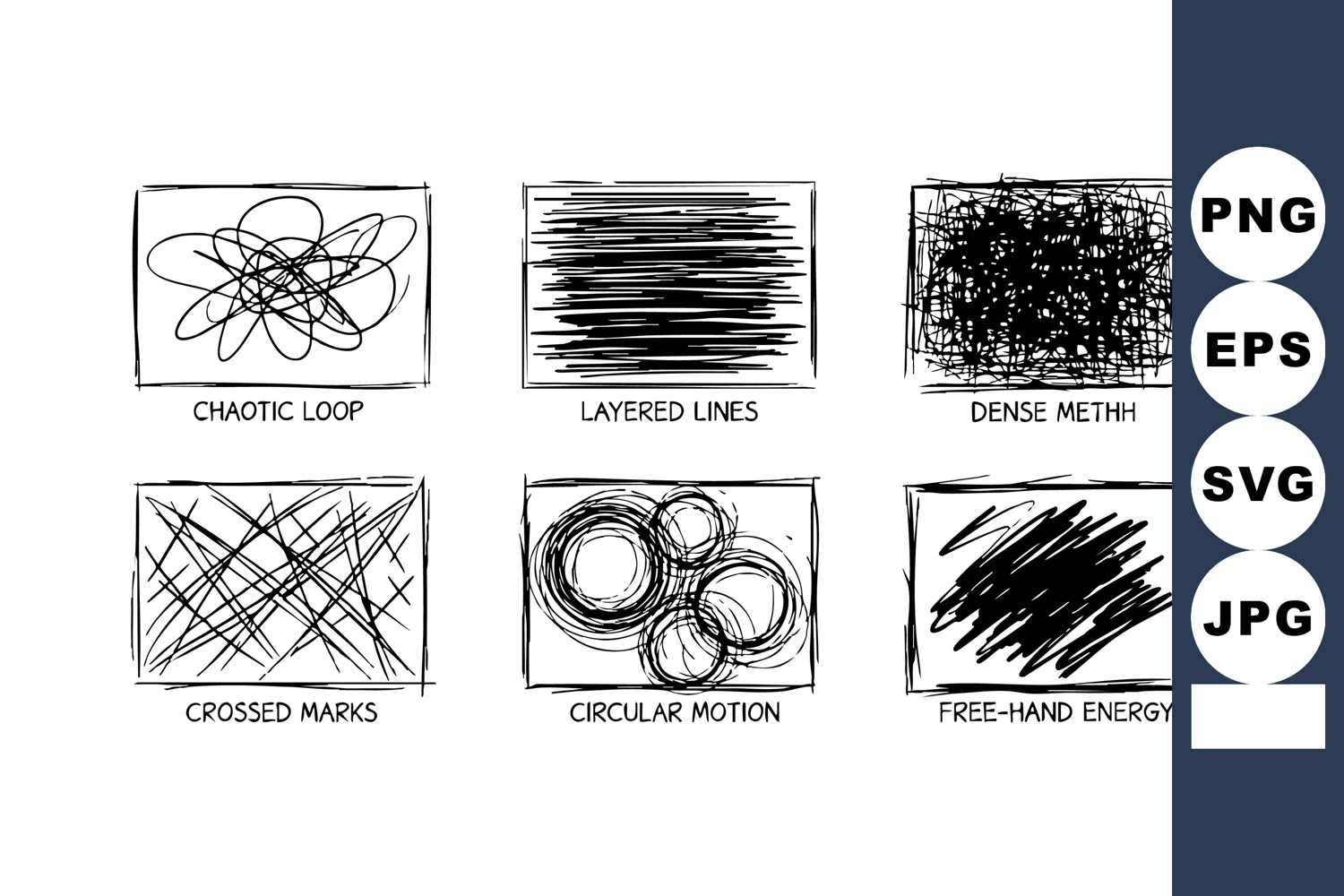 Vector set of abstract chaotic loop, layered lines, dense path, crossed marks, circular motion, and free-hand energy sketches in black and white. Minimalist and dynamic mood.