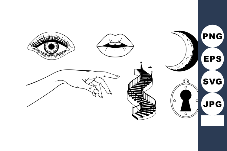 This vector illustration features artistic symbols including an eye, lips, hand, crescent moon, spiral staircase, and keyhole, evoking mystery and surrealism in black and white style. Calm mood.