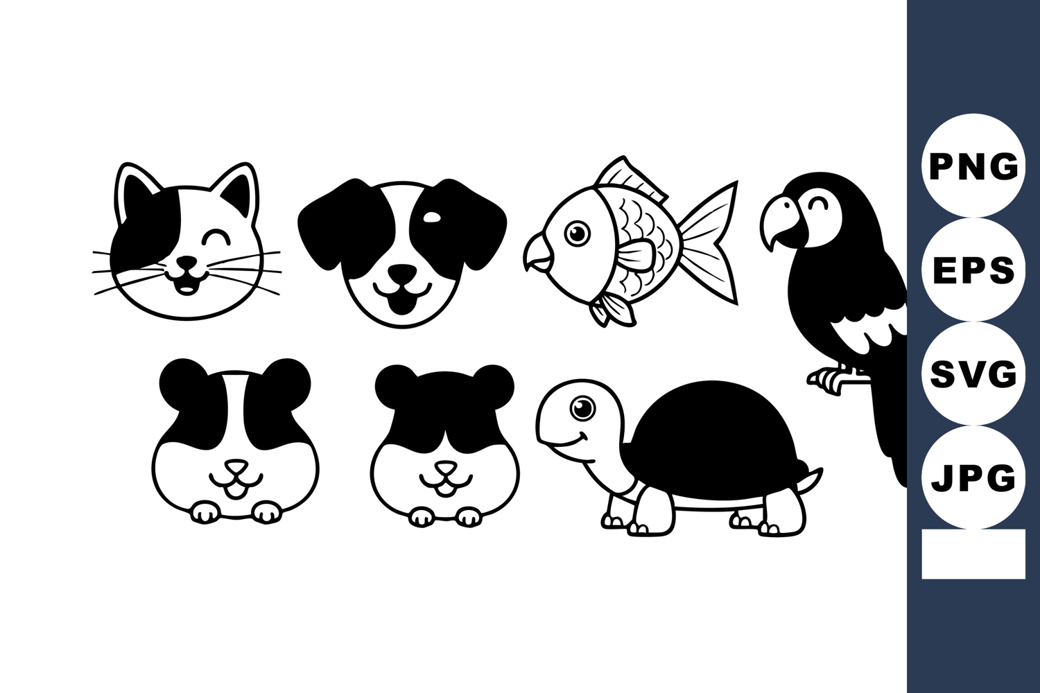 This vector features adorable cartoon pets such as a cat, dog, fish, bird, turtle, and two hamsters in a simple black and white style, creating a playful and friendly mood.