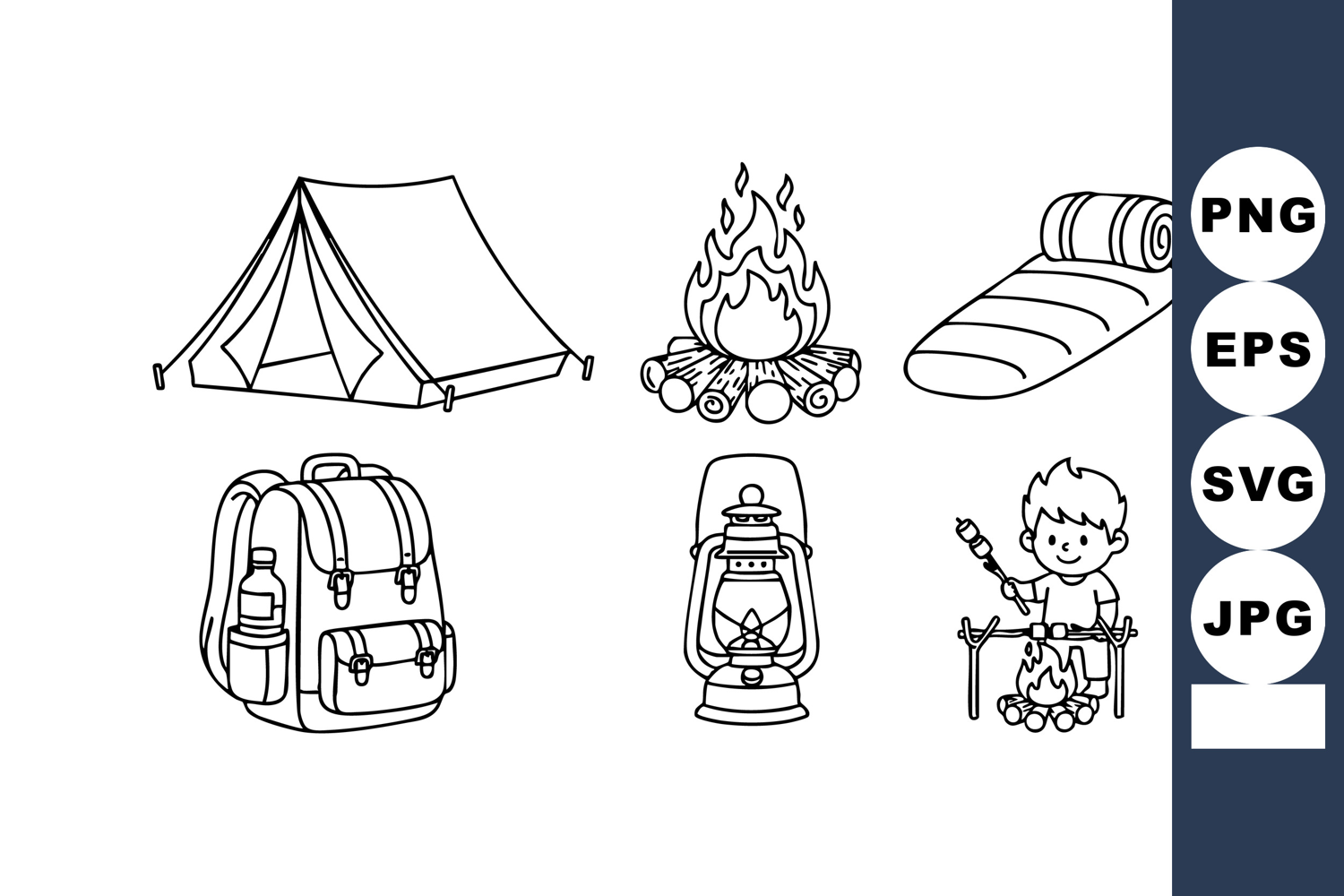 This vector features camping essentials including a tent, campfire, backpack, lantern, and sleeping bag, illustrating outdoor adventure and leisure in a simple black line style, peaceful mood.