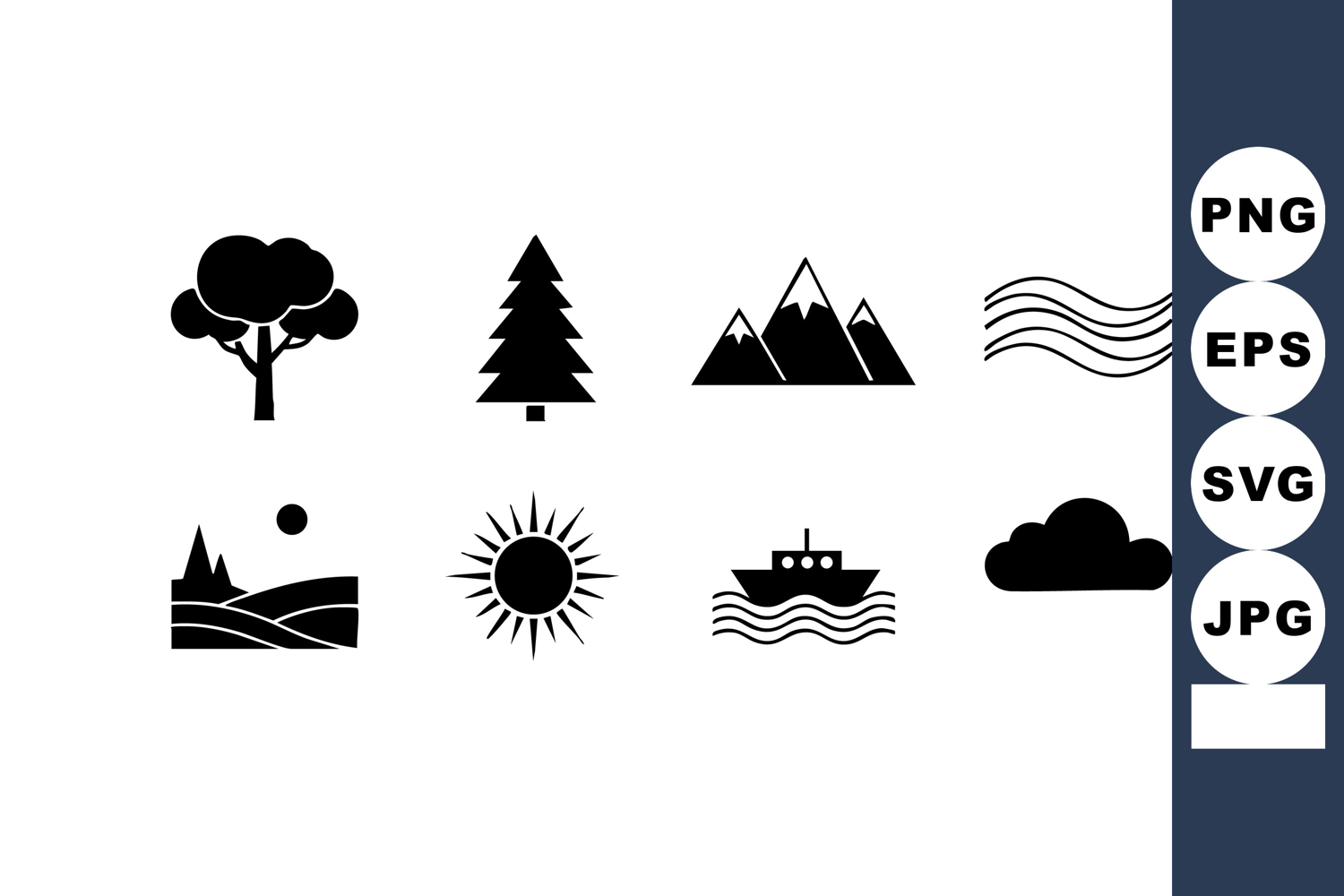 This vector file presents a collection of nature icons including tree, pine, mountain, sun, cloud, boat, wave, and landscape in a simple black silhouette style, clean and modern. Calm and minimalistic.