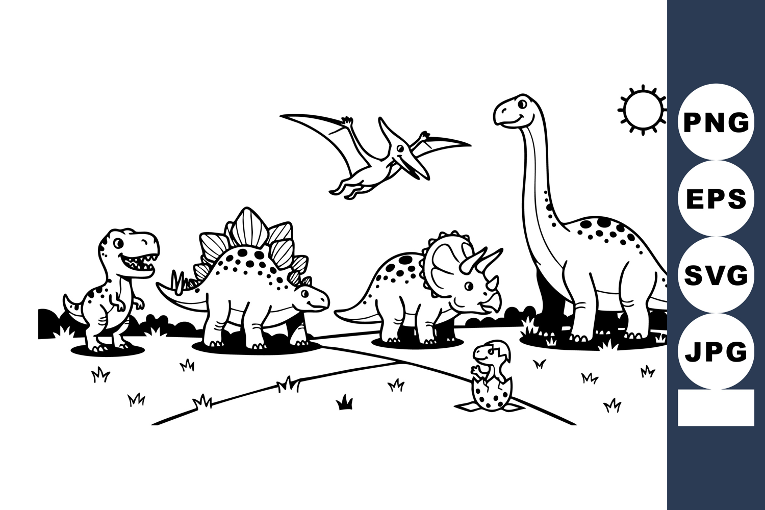This vector drawing shows a dinosaur family featuring tyrannosaurus, triceratops, stegosaurus, pterodactyl, and brachiosaurus in a prehistoric landscape under the sun, playful atmosphere.