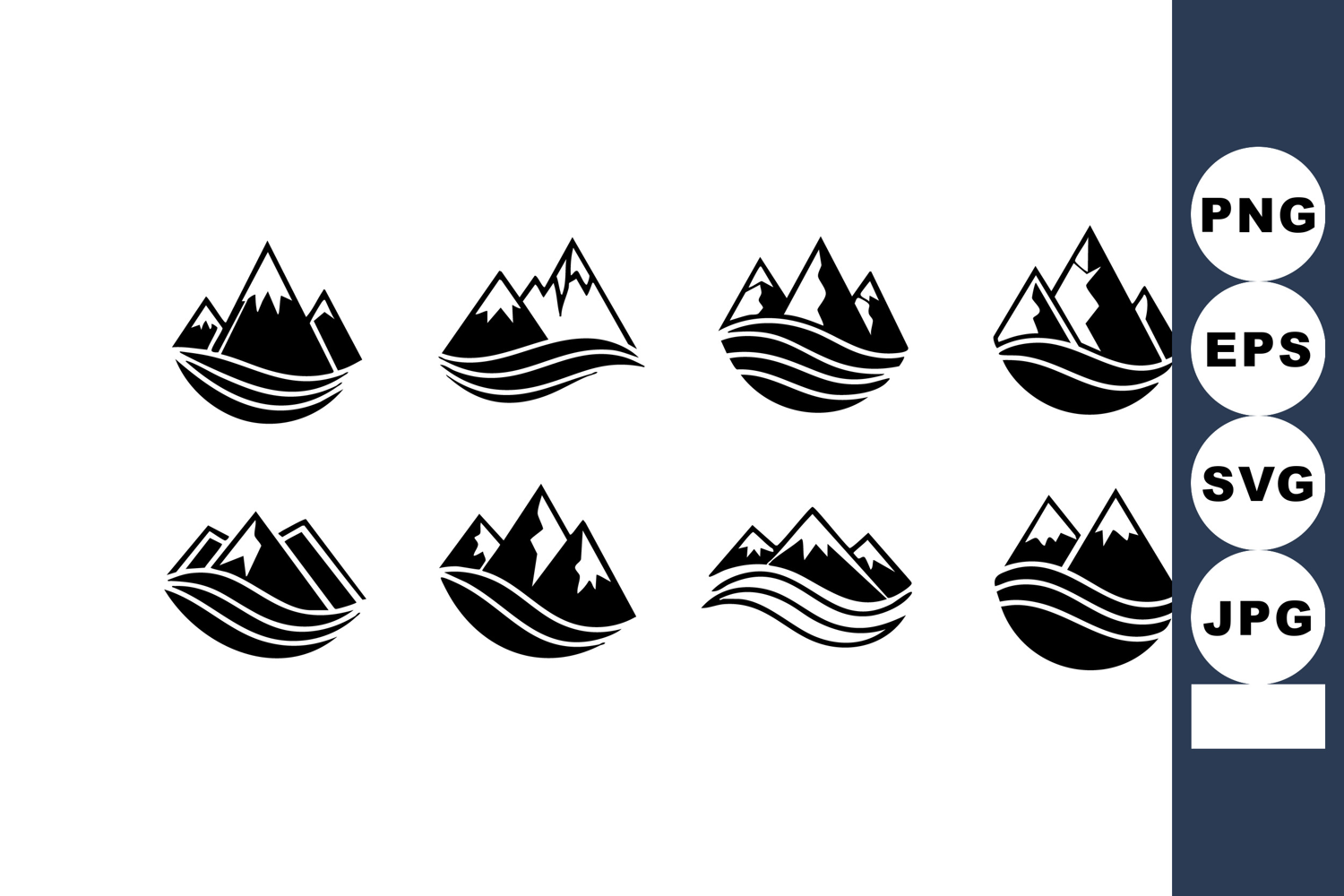 This vector set features stylized black and white mountain and river icons with flowing water and sharp peaks, offering clean minimalistic nature designs for various uses. Calm and simple.