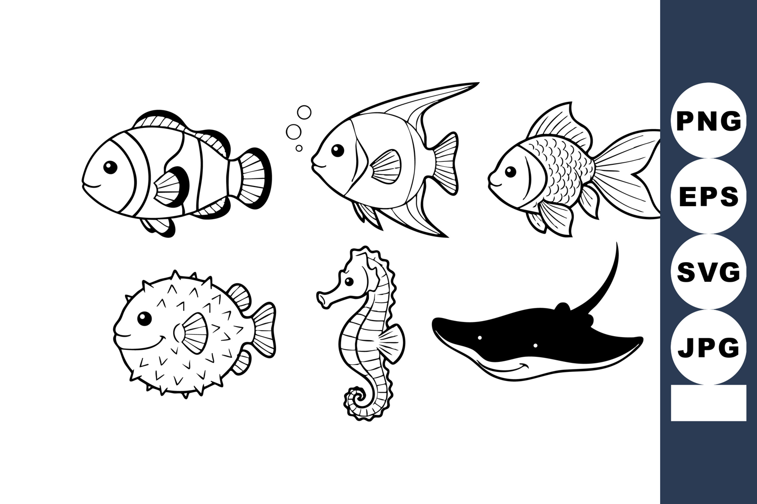 This vector drawing features various tropical fish and marine animals such as clownfish, pufferfish, seahorse, and stingray in a simple black and white style. Calm and educational.