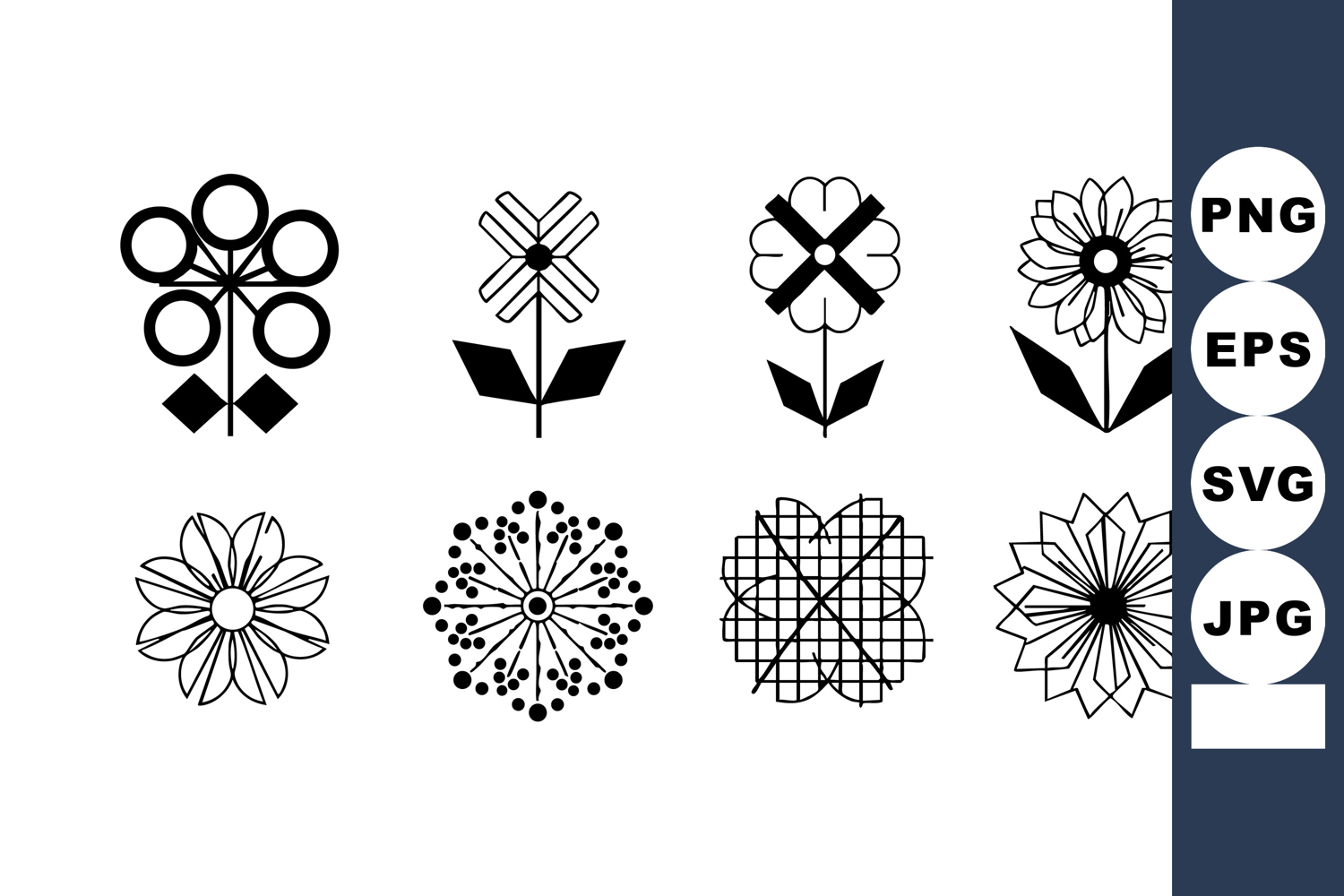 This vector file features abstract floral icons in black and white, showcasing geometric and symmetrical patterns suitable for creative design projects. Modern and clean aesthetic.
