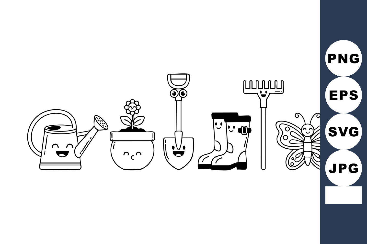 This vector illustration features a happy watering can, flower pot, shovel, boots, rake, and butterfly, all with smiling faces, presenting playful gardening elements in black and white style, cheerful mood.