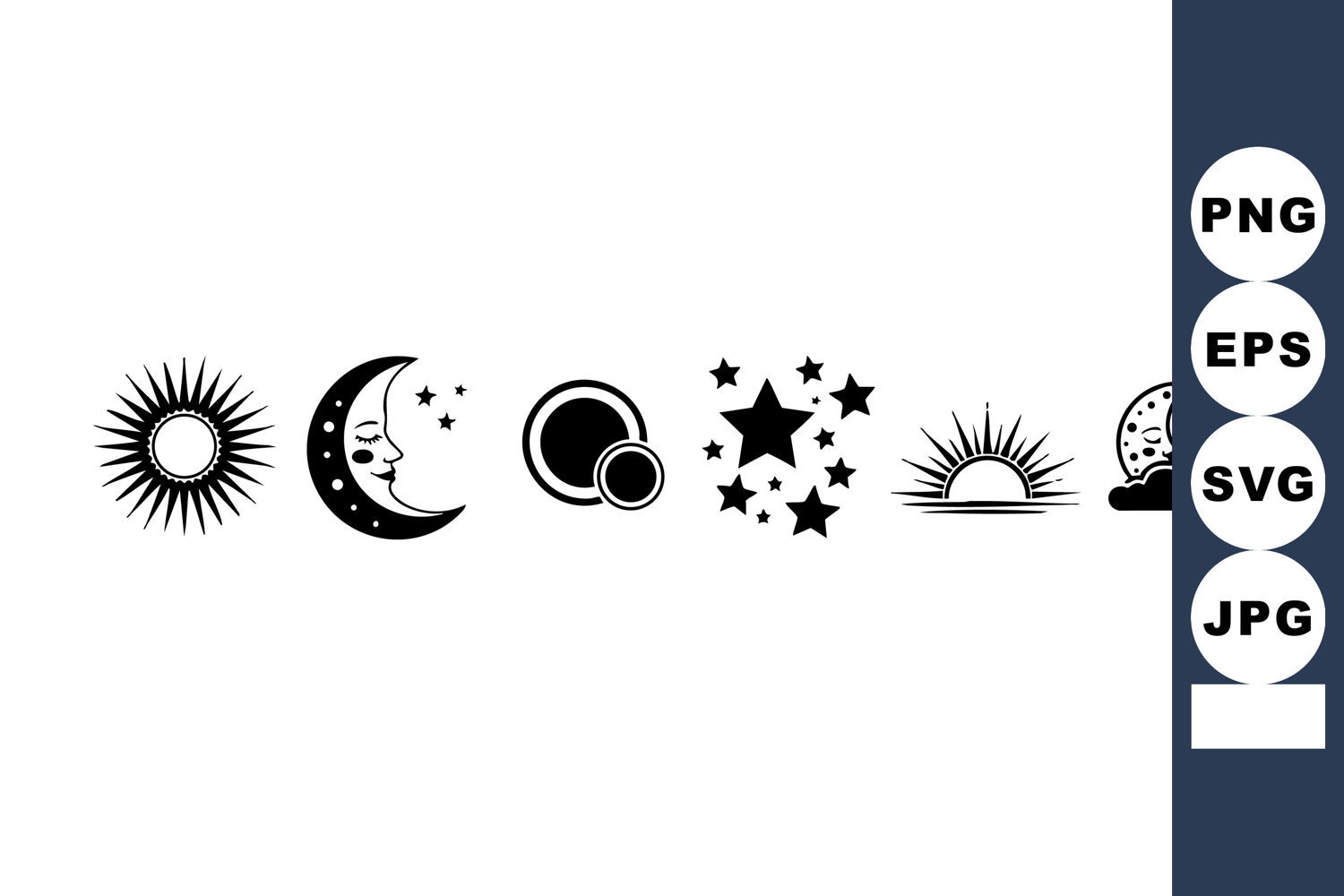 Set of sun, moon, stars, and celestial icons representing day and night sky phases in black and white vector style, showing cosmic harmony and natural rhythm, calm mood.