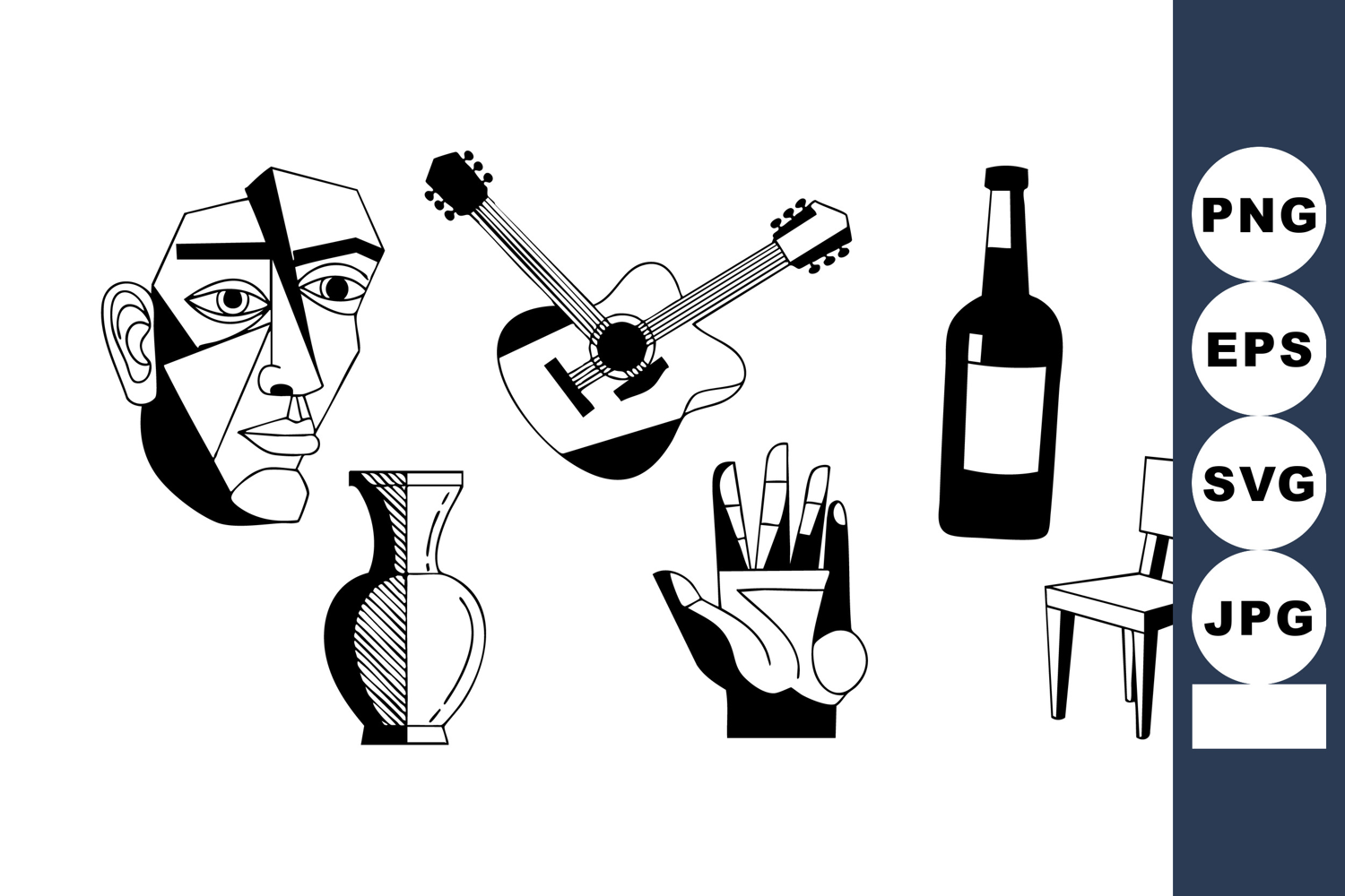 This vector depicts an abstract face, guitar, bottle, chair, and vase in black and white with geometric and stylized shapes, conveying artistic expression and creativity. Modern mood.