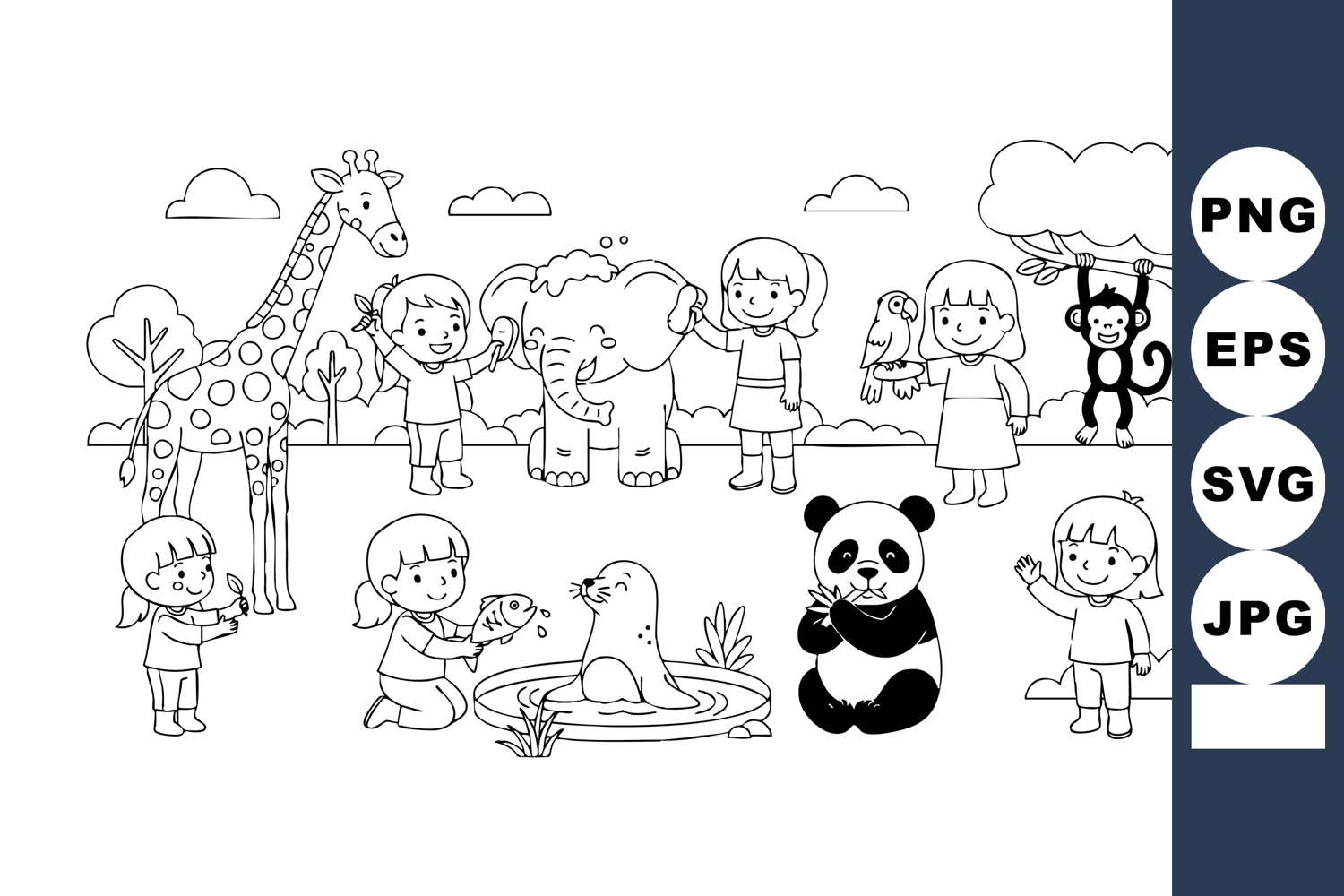 Illustration shows children happily interacting with wild animals such as giraffe, elephant, panda, and monkey in a natural outdoor setting. The scene is playful and joyful.