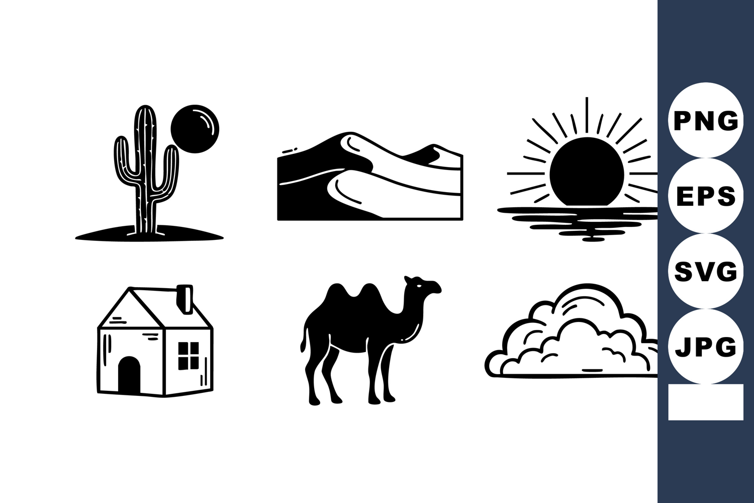Vector icons depicting desert scenery with cactus, rolling sand dunes, sunset over water, simple house, camel silhouette, and fluffy cloud shapes in black and white style. Calm mood.