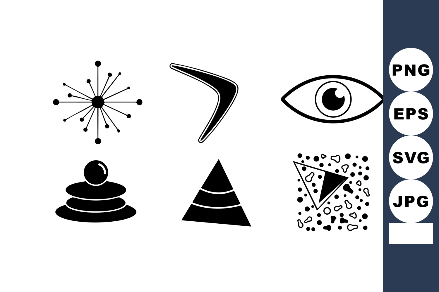 This vector file presents abstract black and white icons featuring an eye, pyramid, boomerang, atomic structure, meditation stones, and confetti pattern in a minimalist style, calm mood.