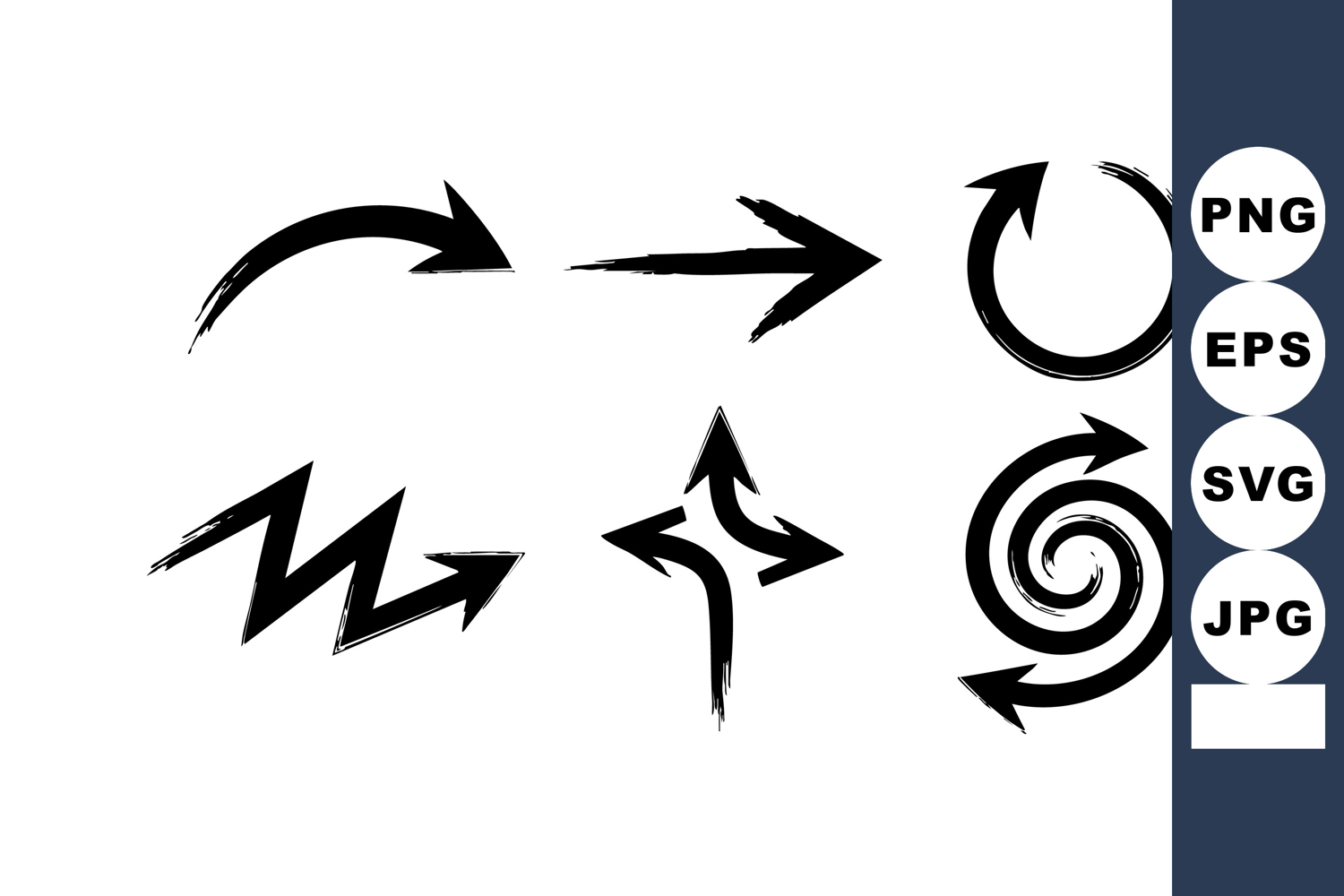 This vector image shows a set of abstract black arrows including curved, spiral, zigzag, and directional shapes. The design is simple, bold, and dynamic, conveying motion and flow. Energetic mood.