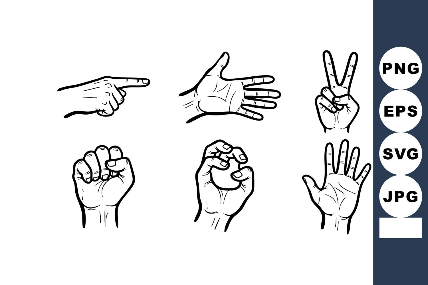 This vector illustration displays six different hand gestures, each with unique finger poses and expressions in black and white. The design highlights clear outlines and simple shapes, creating a versatile and neutral mood.