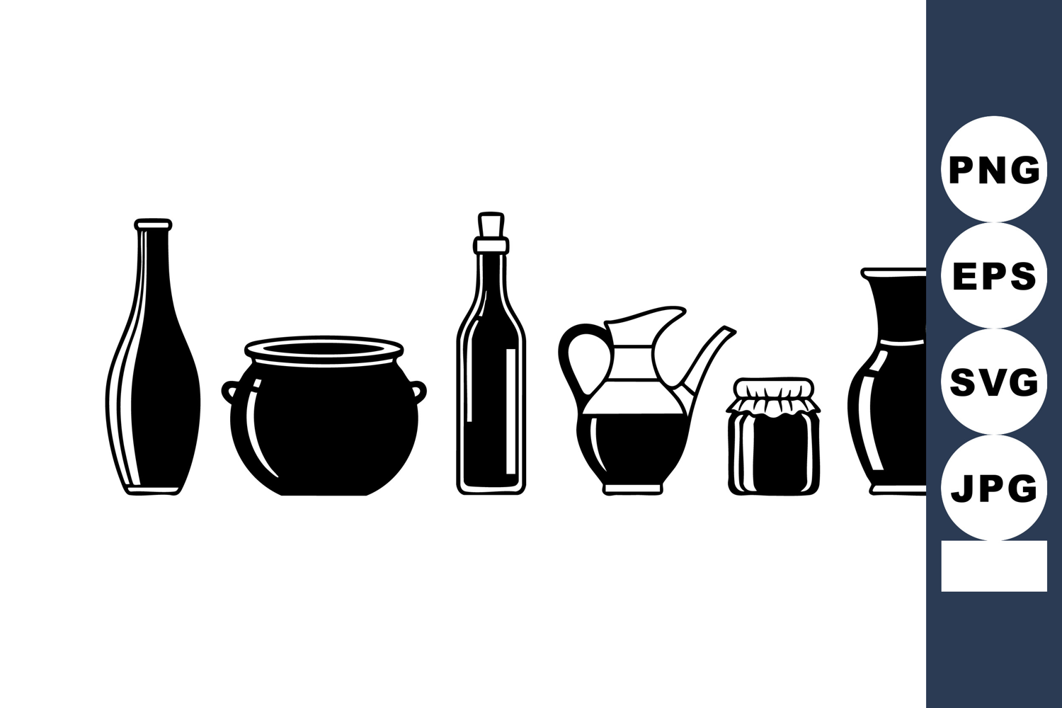 Vector shows six black silhouettes of vintage bottles, jars, and pitchers in a simple style, suitable for design and decoration projects, with clear shapes and classic forms. Calm.