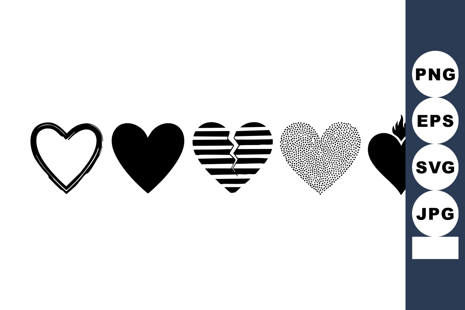 This vector file shows five heart shapes featuring varied textures and styles, including outline, solid, striped, dotted, and flaming designs, perfect for creative and decorative projects. Artistic and versatile.