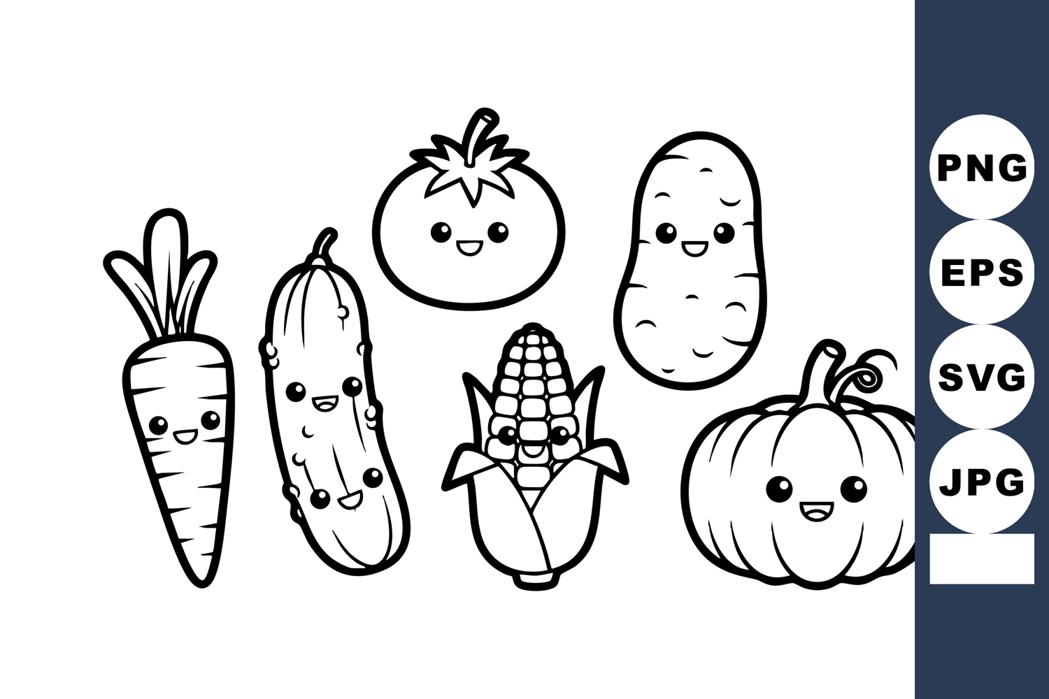 Vector illustration showing cute smiling carrot, tomato, cucumber, corn, potato, and pumpkin with happy facial expressions in black and white style, cheerful mood.