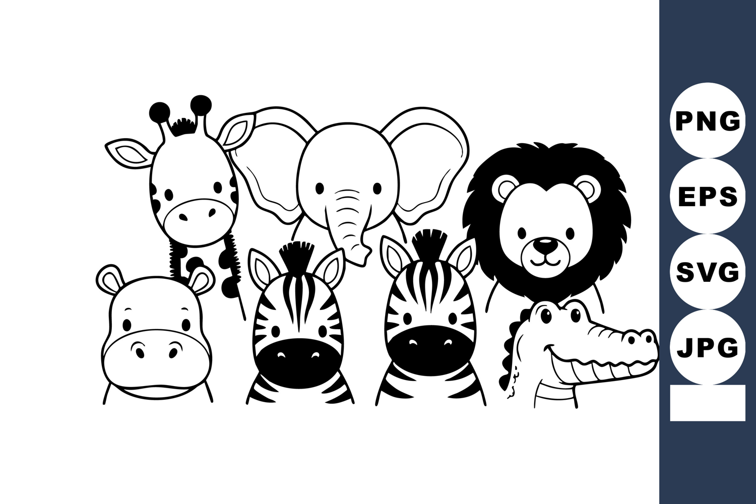 This vector illustration features cute cartoon heads of seven wild animals including giraffe, elephant, lion, zebra, hippo, and crocodile in black and white style. Cheerful mood.