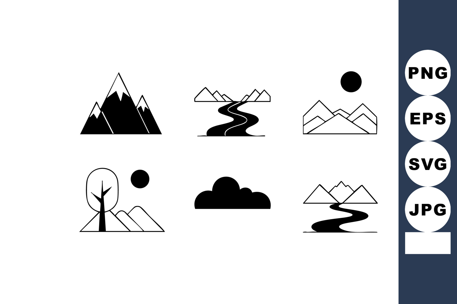 Mountain and river black silhouette icons collection with su example image 1