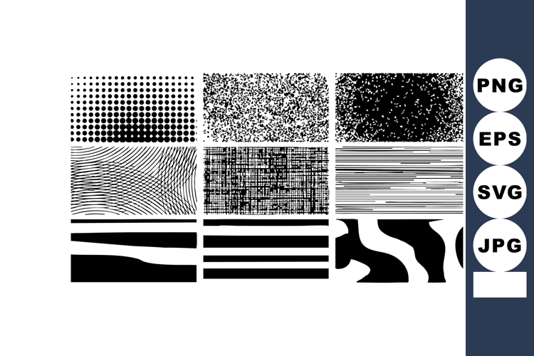 This vector file presents a collection of abstract black and white grunge and halftone textured patterns in various linear and organic styles, perfect for creative design projects. Bold and versatile.