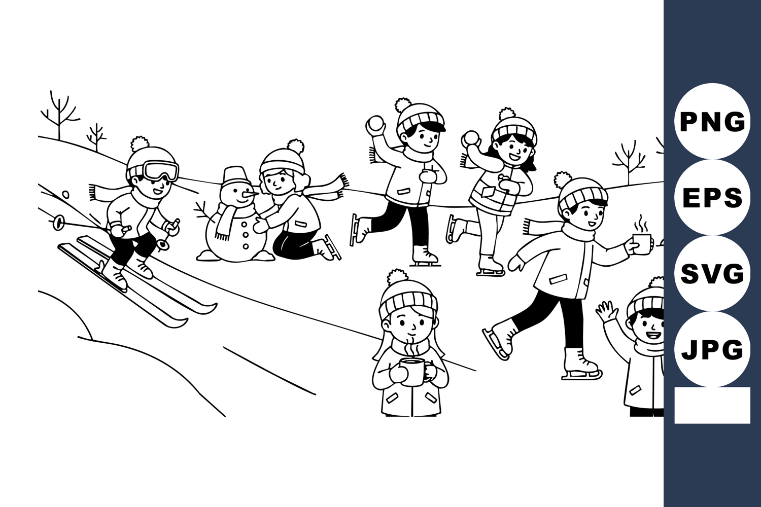 This vector shows children skiing and playing happily in the snow wearing winter hats and jackets, capturing the joyful outdoor winter fun in a cold season. Cheerful mood.