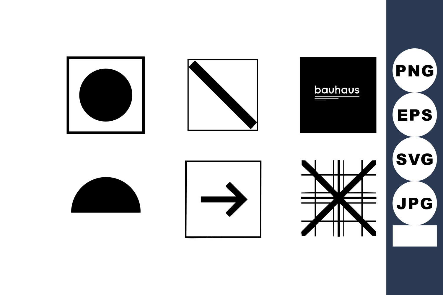 This vector features black and white geometric shapes and abstract Bauhaus style symbols in a grid layout, emphasizing minimalism and modernism. The design feels clean and structured.