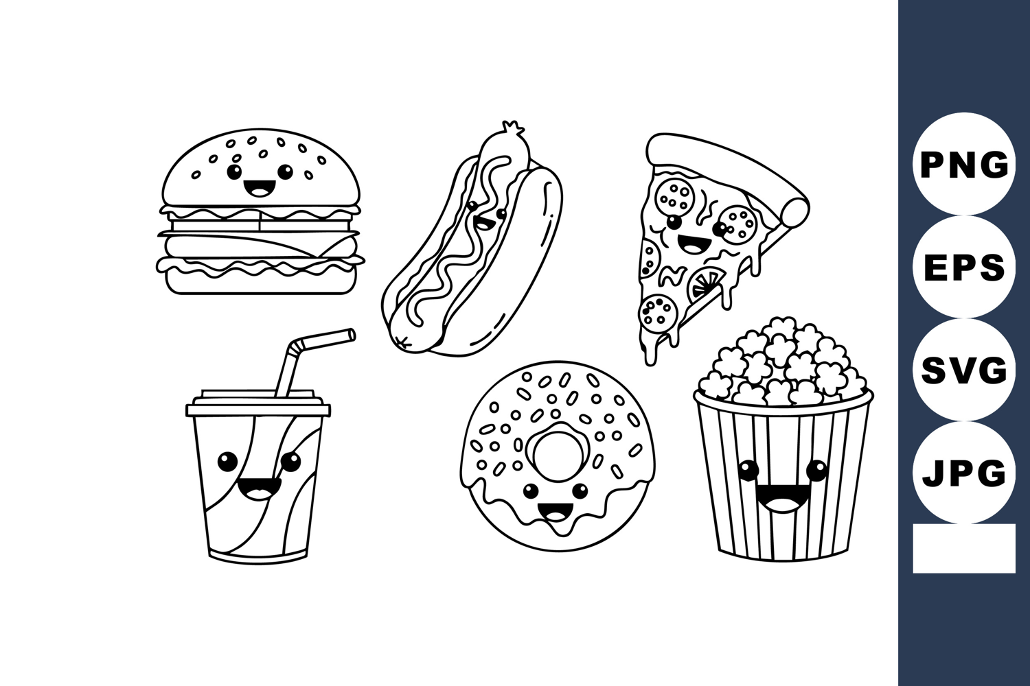 Vector shows cheerful fast food items with expressive faces including burger, hot dog, pizza, popcorn, donut, and soda cup. Fun and playful mood.