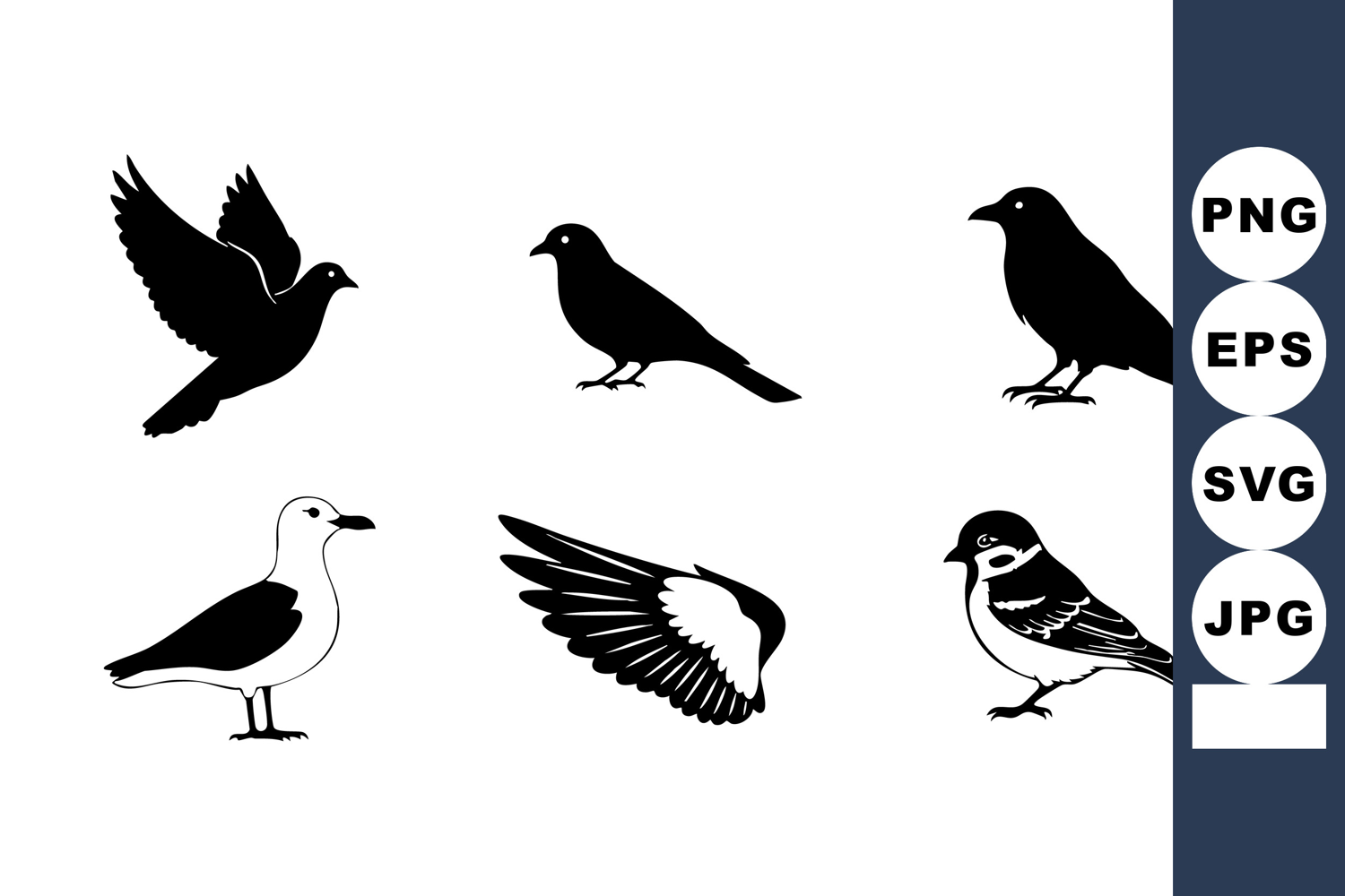 Vector set features six black silhouette birds showing flying and perched poses, perfect for creative bird-themed projects. Simple and elegant design with clear shapes, minimalistic style, calm mood.