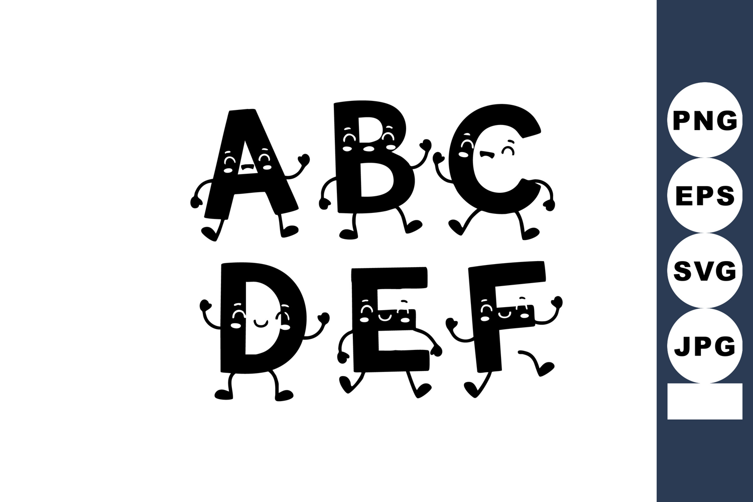 This vector image shows alphabet letters ABCDEF with quirky cartoon arms and legs in black, creating a fun and playful typographic design. Cheerful mood.