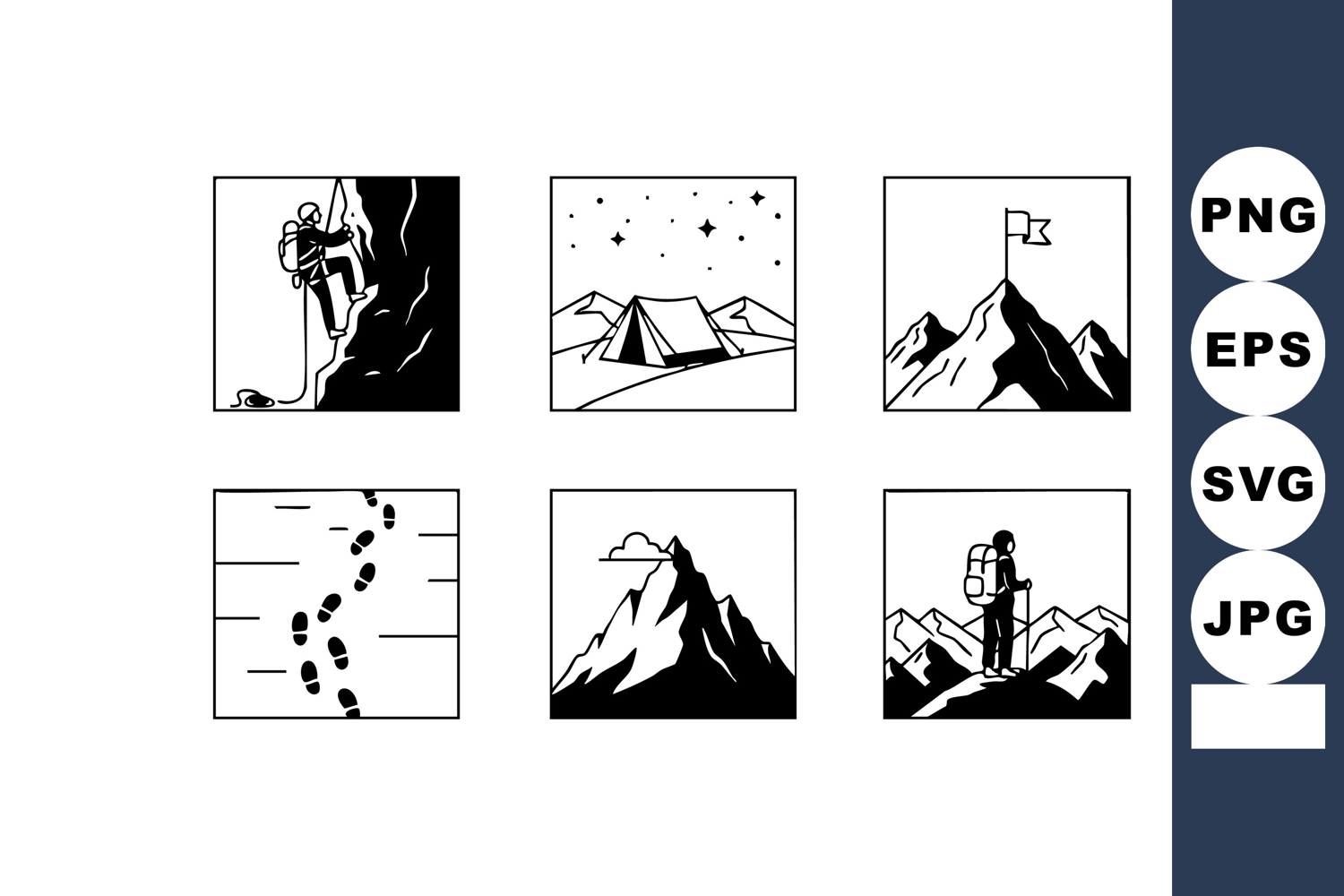 Vector icons show mountain climbing gear, footprints on trail, mountain peaks, and summit flag with climber gear in black and white style, evoking adventurous and bold mood.