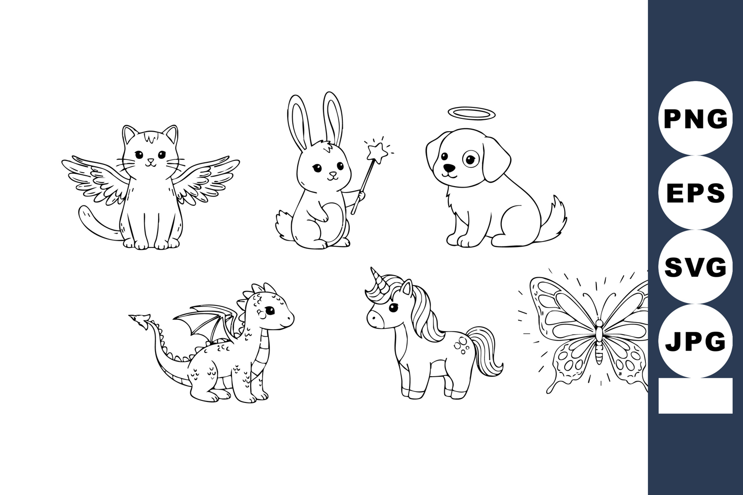 Vector line art collection features cute fantasy animals such as winged cat, rabbit, haloed dog, dragon, unicorn, and butterfly in simple black outlines, playful and charming.