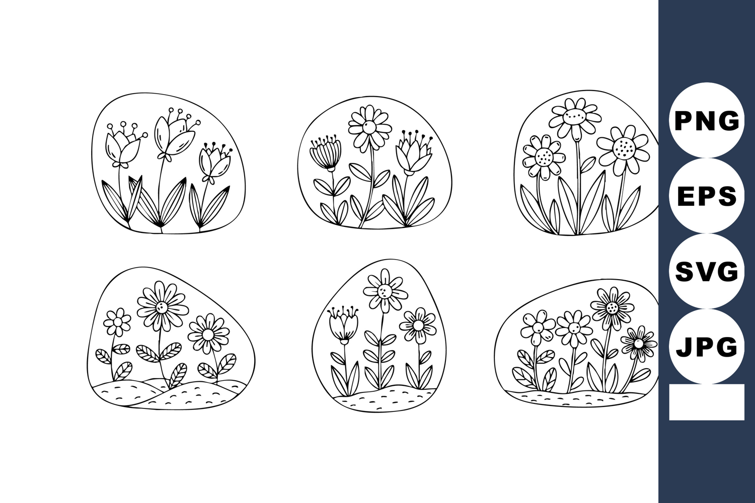 This vector set features six elegant wildflower garden illustrations with fine line art, showcasing delicate flowers and leaves in a minimalist black and white style, perfect for nature-inspired designs, calm and refined.