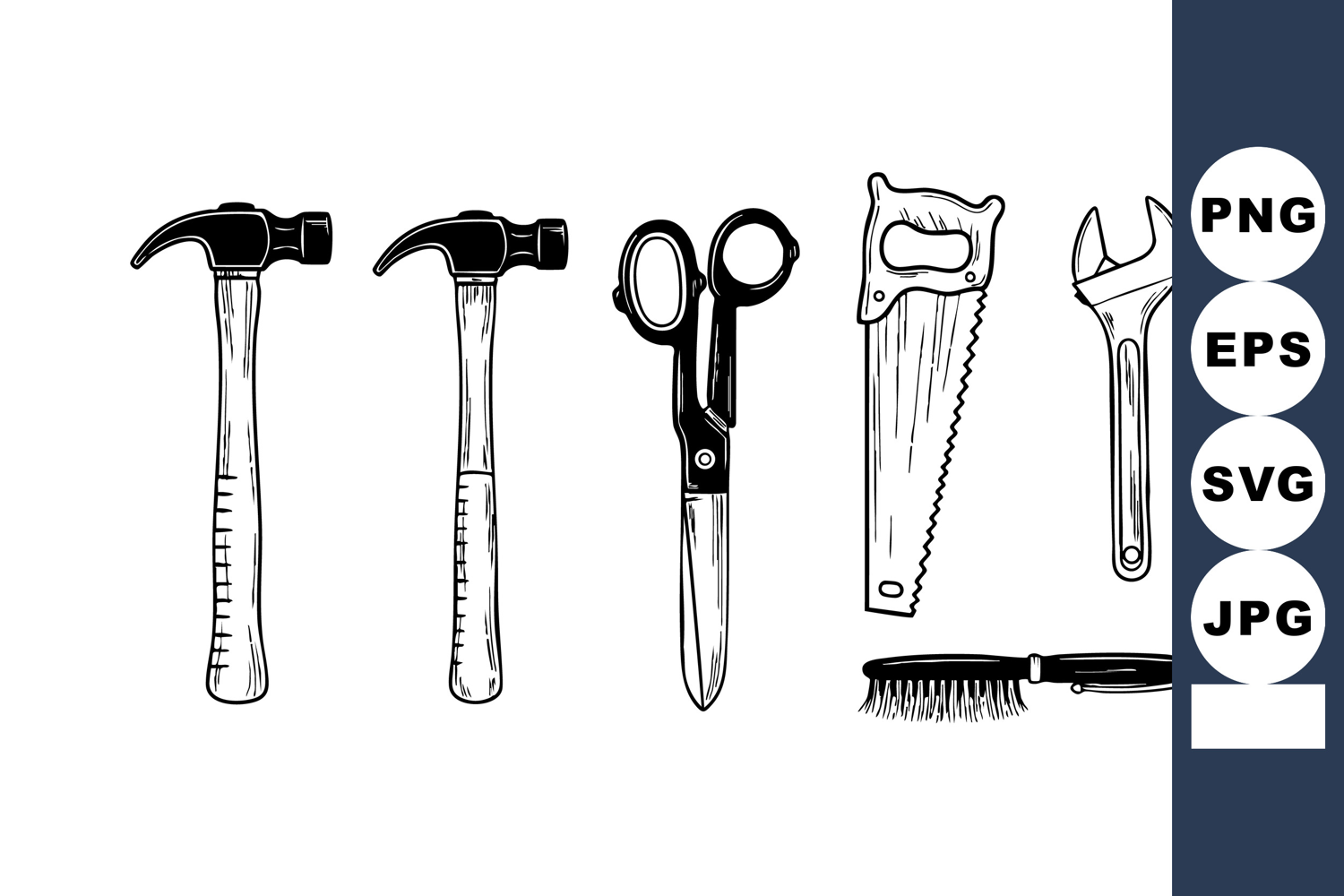 Vintage Brush Hand-drawn Black Scissors Hammer Saw Tool White Wrench