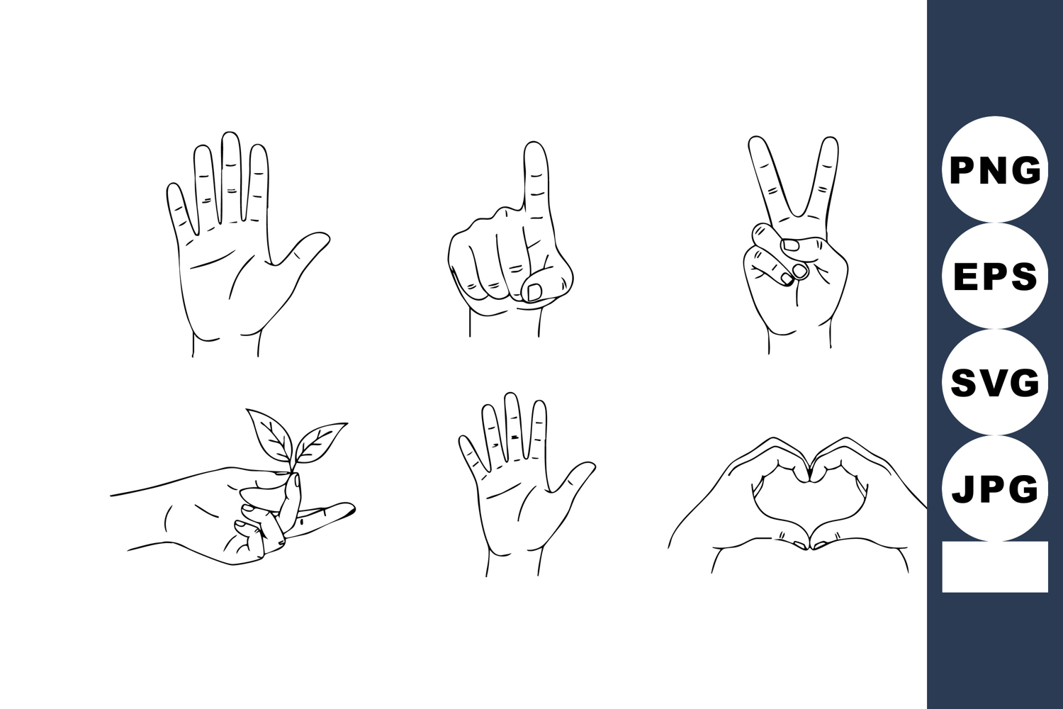 This vector file shows six hand gesture symbols including love, heart, peace, pointing finger, and plant growth icons in simple outline style. Suitable for communication and nature themes, calm mood.