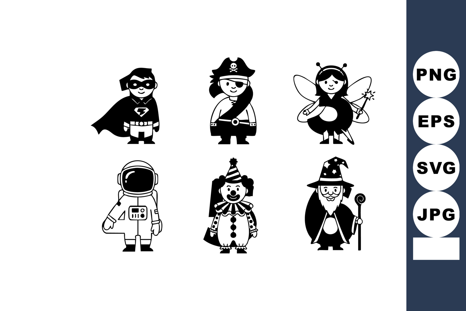 This vector features six black and white children costume icons including superhero, police officer, fairy, astronaut, clown, and wizard. The design is playful and charming. Cheerful mood.