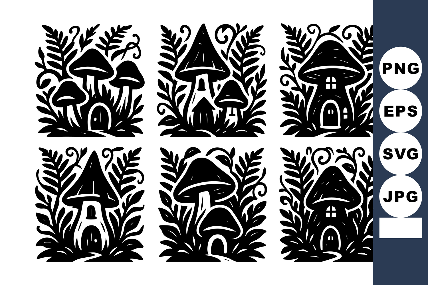 This vector features black silhouette mushroom houses surrounded by leaves and plants, creating a whimsical fantasy forest atmosphere with detailed organic shapes, perfect for creative projects, mystical and charming.